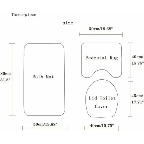 - Set includes: 1 bath mat (80 x 50 cm), 1 contour bath mat (50 x 40 cm) and 1 toilet lid cover (45 x 50 cm).