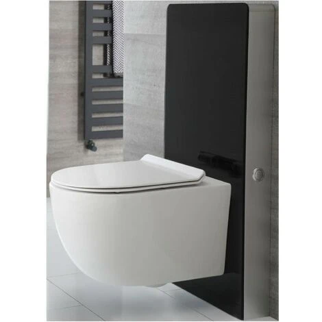 – Premium quality ceramic wall hung rimless toilet with hard-wearing white glazed enamel and soft close seat