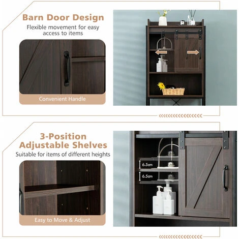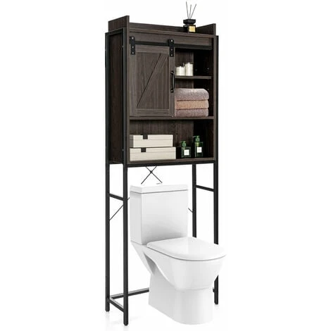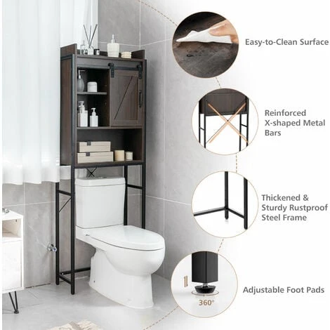 Our freestanding toilet storage cabinet will be a great helper for storage in small places. This bathroom space saver maximizes the wall and offers 4-tier storage shelf for towels, toilet paper and more. And the adjustable shelf allows you to well organize supplies of different heights. The sliding barn door design not only adds more glamour to your space, but also handy to take and put items. The sturdy steel frame and premium engineered wood material offer long lasting service. Also, the over-the-toilet storage cabinet is equipped with the anti-toppling device for more safety. And the adjustable foot pads keep the cabinet level on uneven floor. The assembly is easy and quick with the instructions.