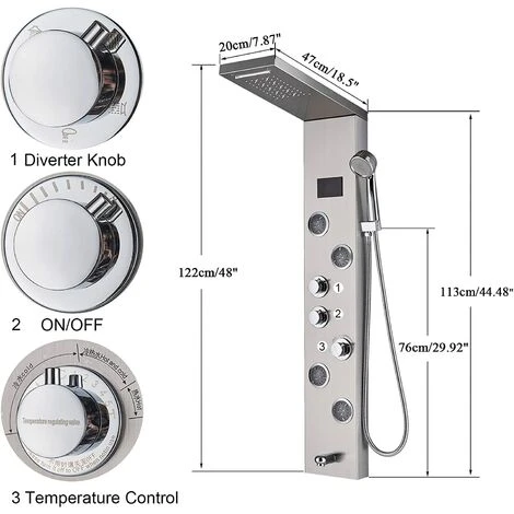 Shower panel height: 127 cm (50 inches), width: 20 cm (7.87 inches), shower hose length: 150 cm (59 inches).