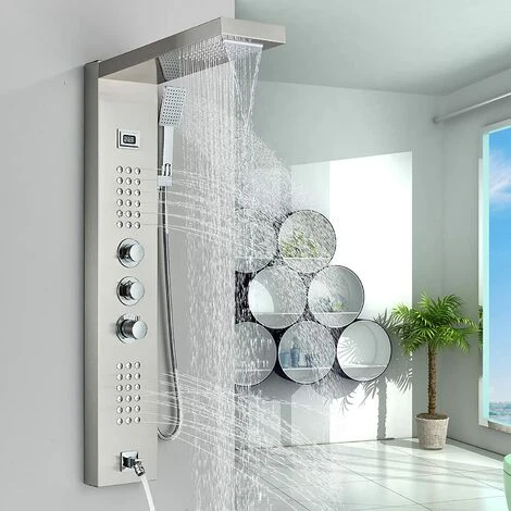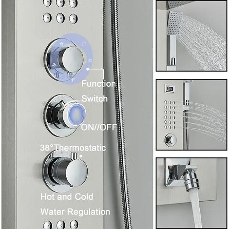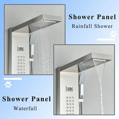 5-function brushed nickel stainless steel design, 2-function top spray allows you to enjoy a natural rain-like rain experience, 36 small massage silicone nozzles are gentle and comfortable, and the hand shower connected to a 150cm hose is more convenient, with a bathtub spout. The small screen can monitor the water temperature at any time and effectively prevent burns, making it safer for you and your family to use!